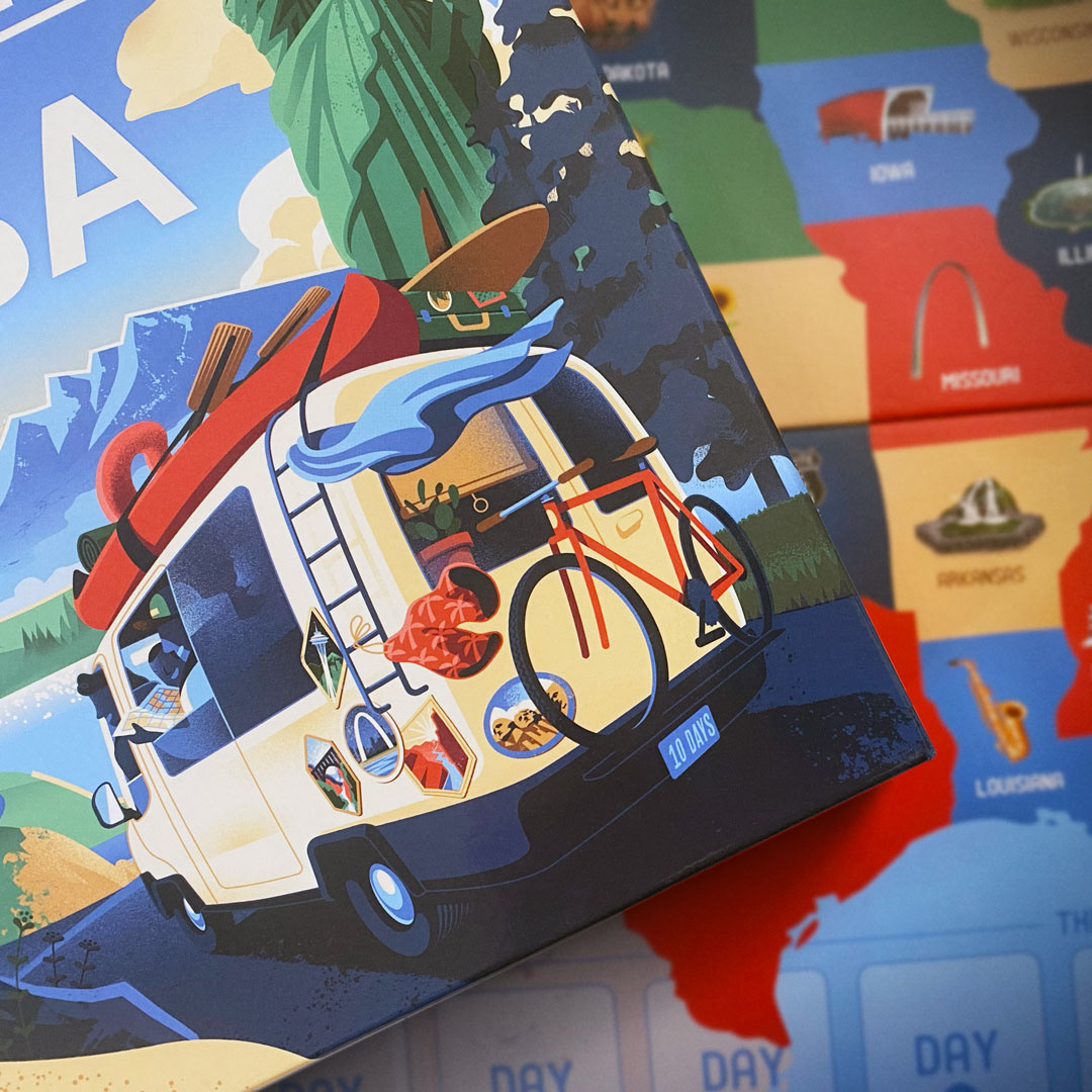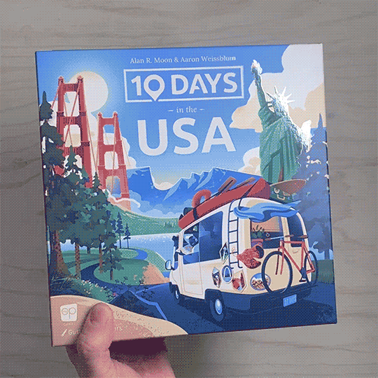 Illustrated box for OP Games' redesign of 10 days in the USA - originally created by board game nestor Alan R. Moon.
