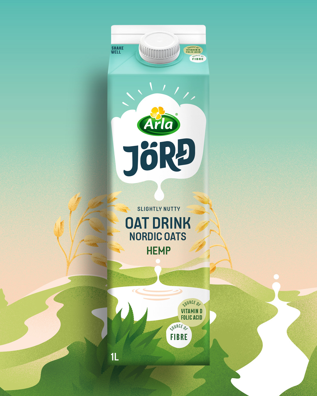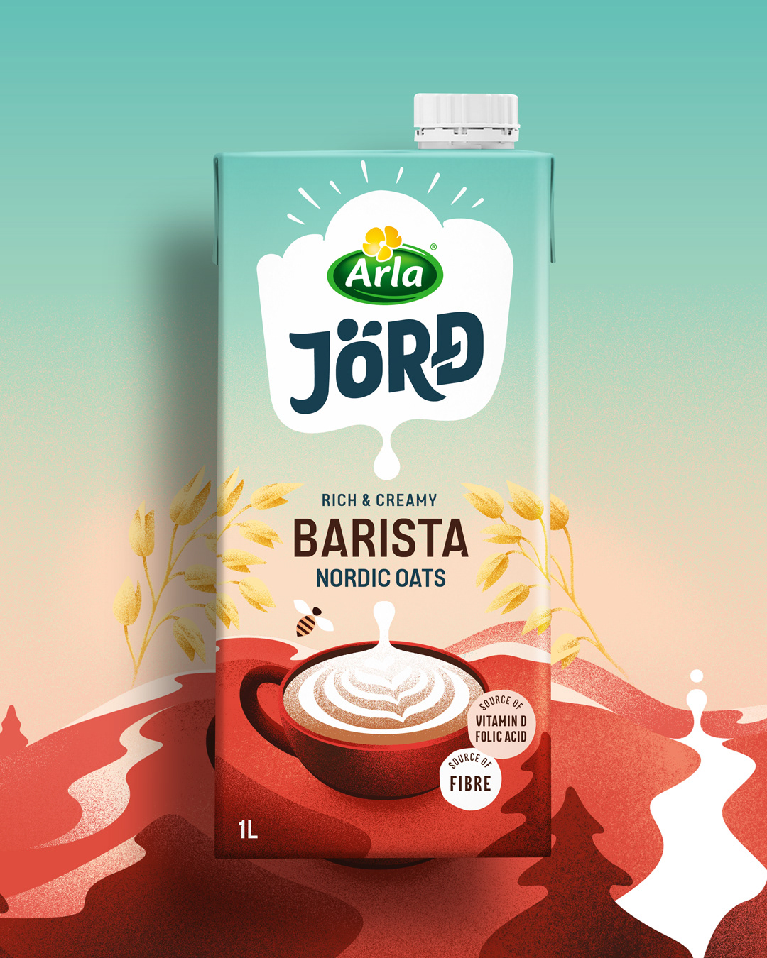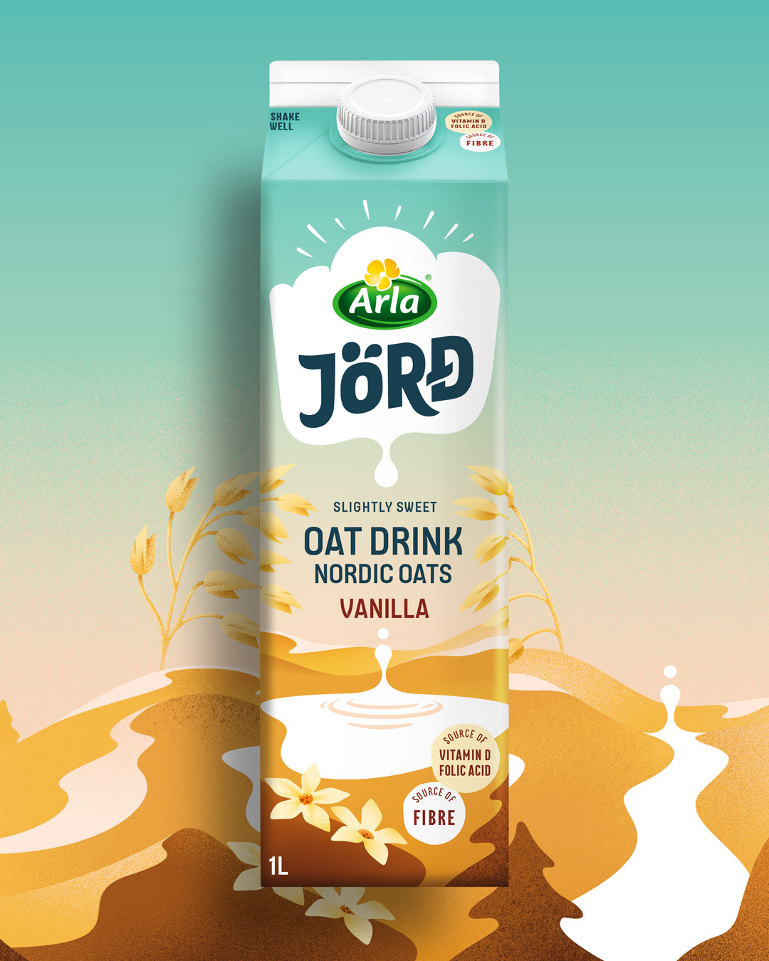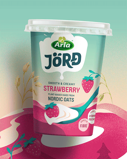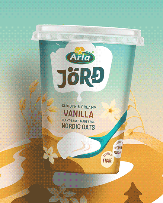 Packaging design for Arla's new oat drink Jörd. The design is a full wrap around, that seamlessly runs around the package. The designs were adjusted for two types och tetras, as well as a cup for the "Gurt" flavors.